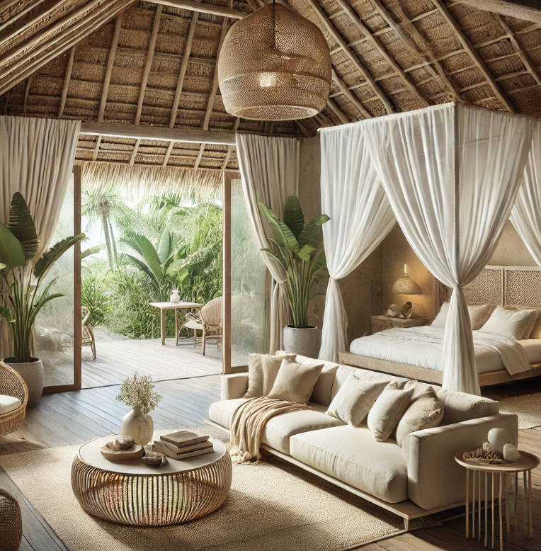 Decor Vibe: Eclectic with a warm, earthy color palette, rattan light fixtures, and handcrafted wall hangings.